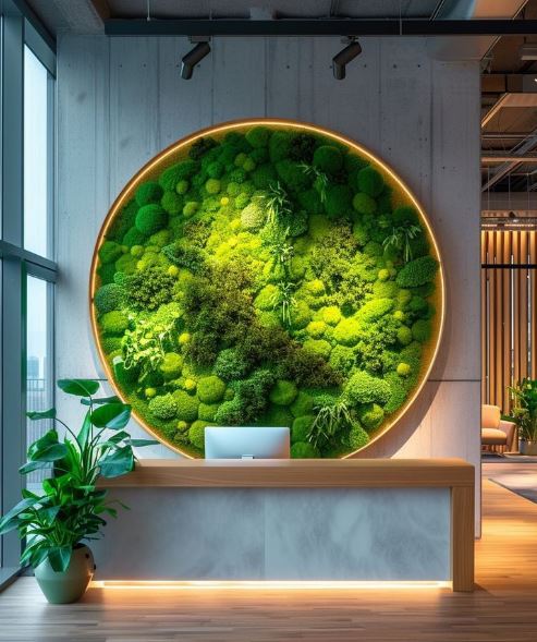 A zöldítés megvalósítható egy kis csalással is: a zuzmófal az élő növények érzetét adja, bár nem élőbb, mint a műnövény… Mohafalnak is hívják, bár stabilizált, festett zuzmóból készül.