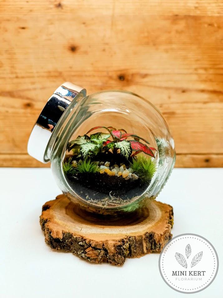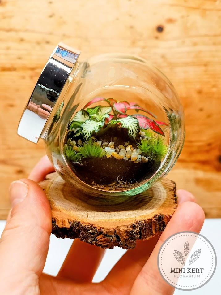 Ez a maroknyi florárium mindenben megegyezik a “Mini döntött florárium” termékünkkel. A különbség csupán a fakorong talp, amire stabilan rá van erősítve az üveg. Ennek köszönhetően a florárium felborulásának kockázata minimális.