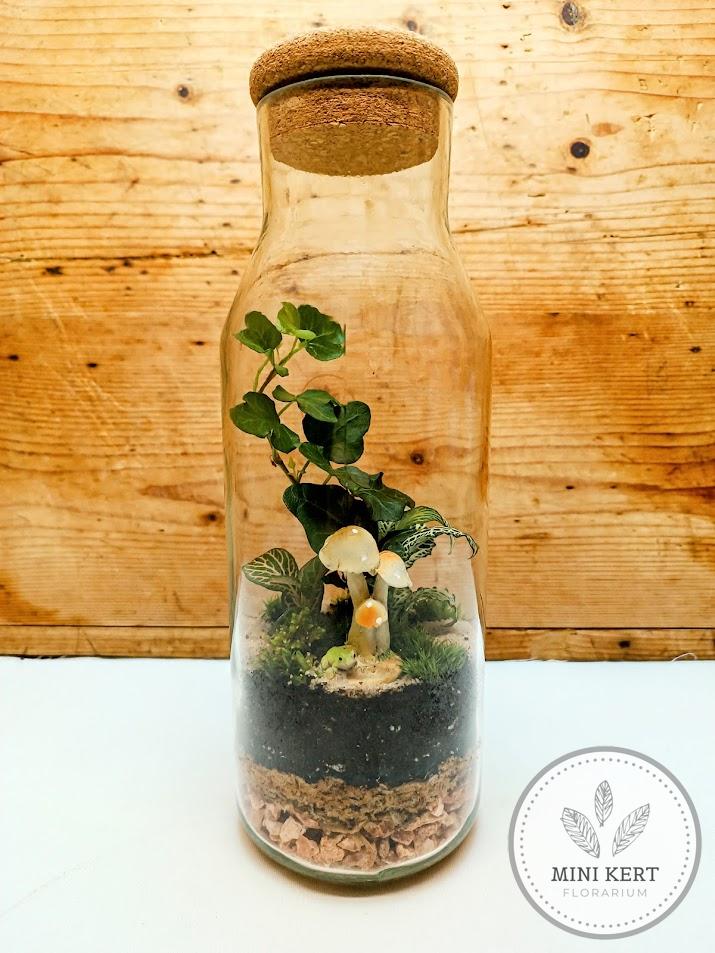 Ezt a parafadugós palackkertet több összeállításban is készítjük, és szinte mindig van belőle elkészített darab. Az összeállítást fittóniával, ficus-szal, borostyánnal vagy pálmával készítjük. A felszínt látványos dekorkővel és mohával díszítjük. A növények közé egy figurát helyeztünk.