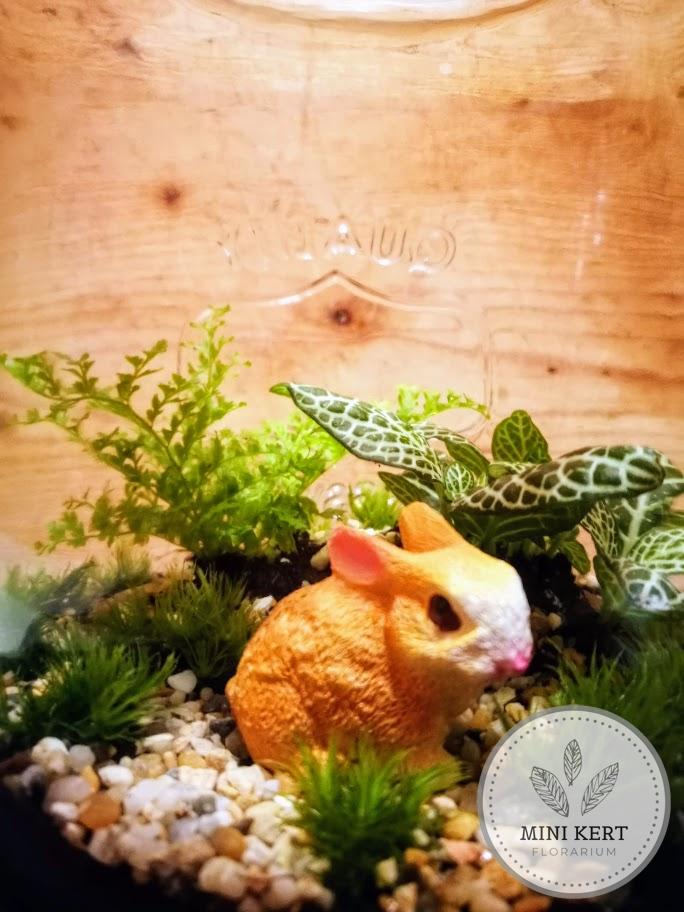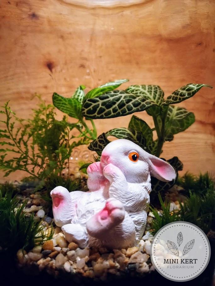 A floráriumot egy dombormintás felirattal készült zárt üvegtárolóba készítettük el. A florárium vízelvezető rétege csillámpala. A zöld növények között barna vagy fehér nyuszi lapul (nyuszikészlettől függően).